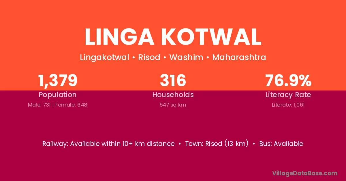 Risod (13 km) is the nearest town to Linga Kotwal village for major economic activities and is located approximately 13 km away.