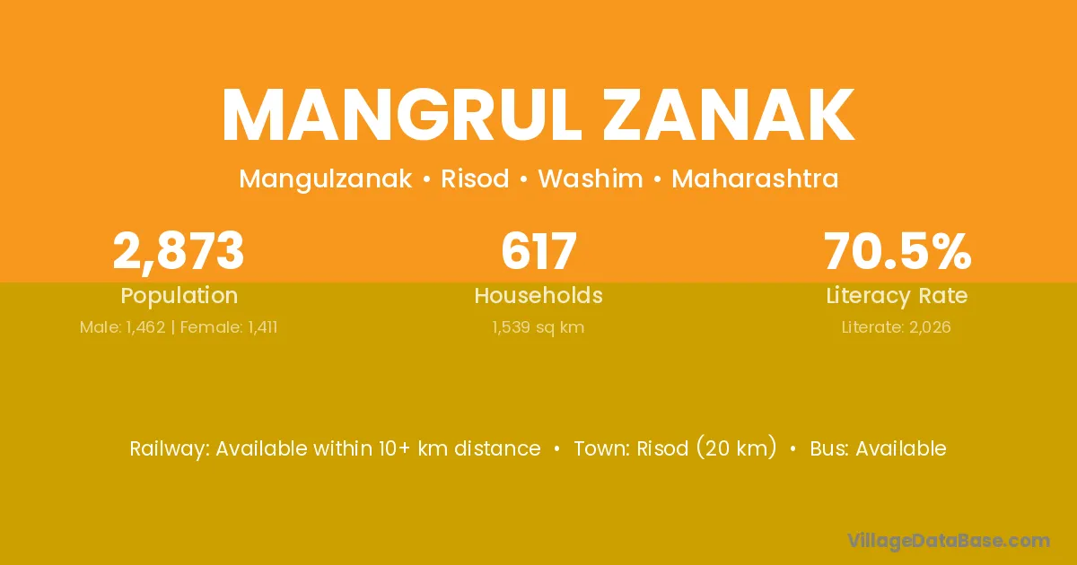 Risod (20 km) is the nearest town to Mangrul Zanak village for major economic activities and is located approximately 20 km away.