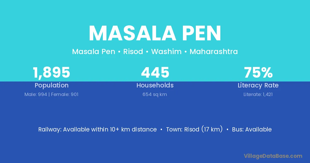 Risod (17 km) is the nearest town to Masala Pen village for major economic activities and is located approximately 17 km away.