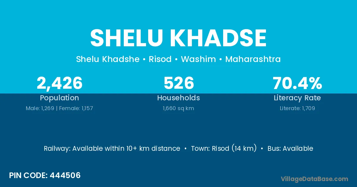 Risod (14 km) is the nearest town to Shelu Khadse village for major economic activities and is located approximately 14 km away.