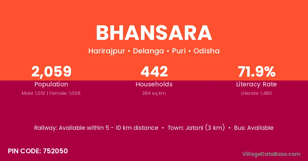 The literacy rate of Bhansara village is 77.62%. Male literacy stands at 81.57% and female literacy at 73.29%.