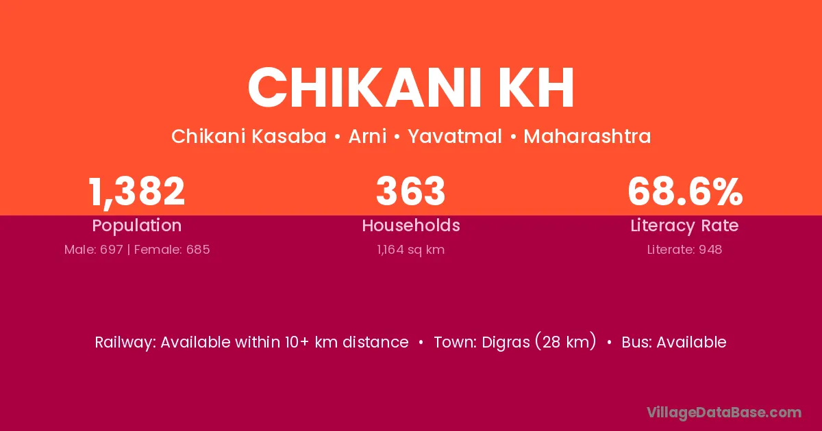 Chikani Kh village has a total population of 1,382 people, of which 697 are males and 685 are females.