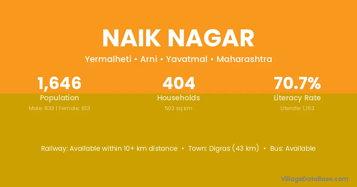 Digras (43 km) is the nearest town to Naik Nagar village for major economic activities and is located approximately 43 km away.