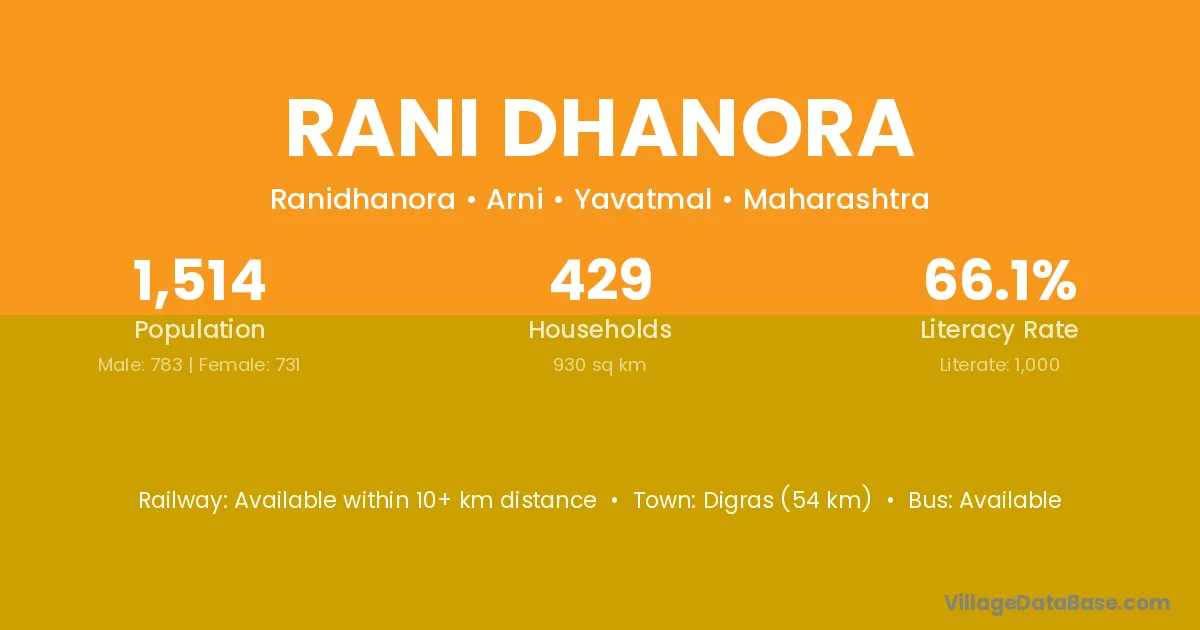 Rani Dhanora village has a total population of 1,514 people, of which 783 are males and 731 are females.