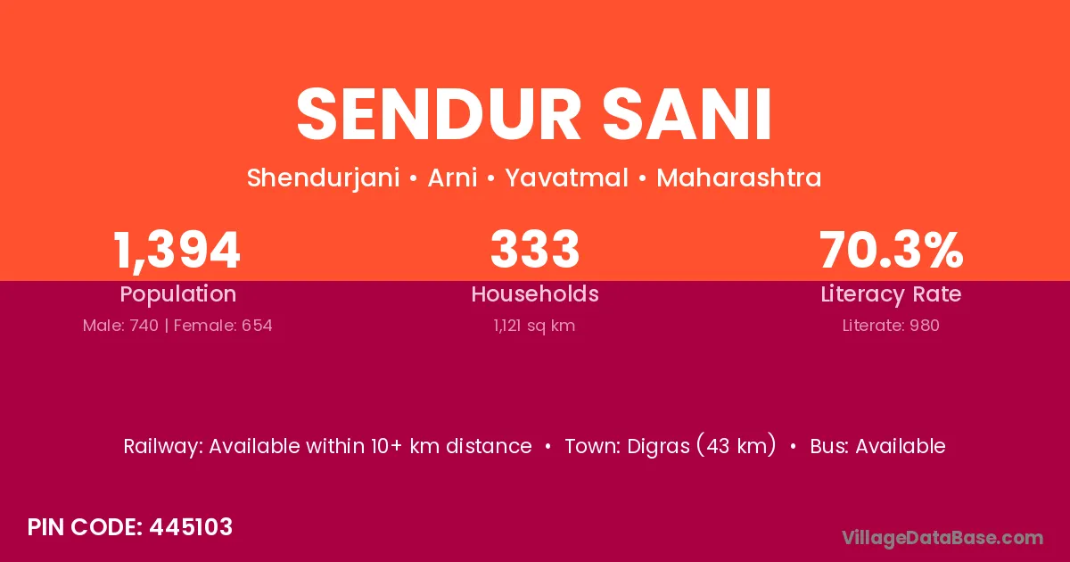 Digras (43 km) is the nearest town to Sendur Sani village for major economic activities and is located approximately 43 km away.