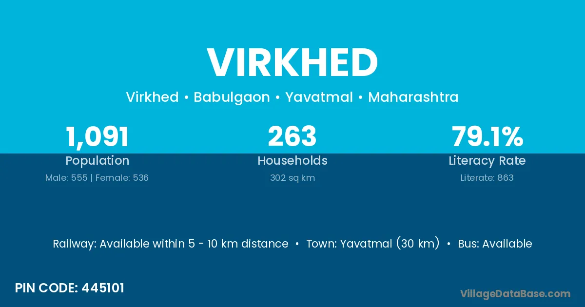 Yavatmal (30 km) is the nearest town to Virkhed village for major economic activities and is located approximately 30 km away.