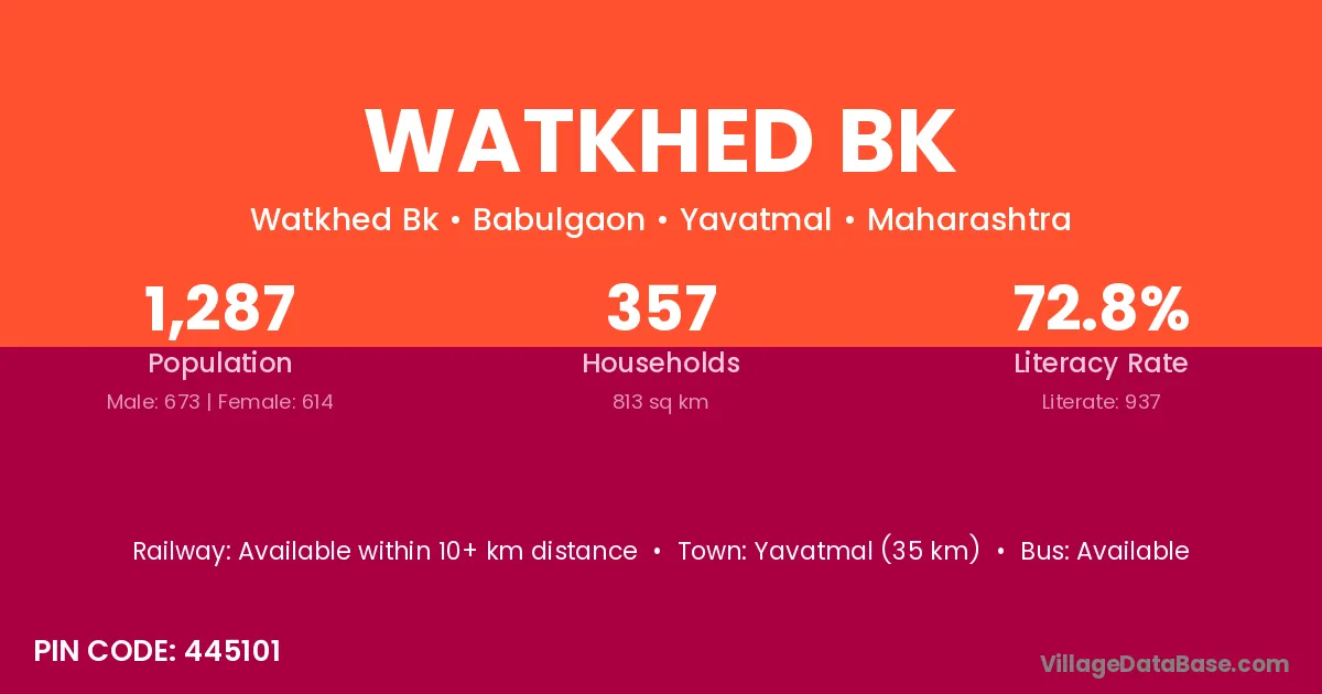 Yavatmal (35 km) is the nearest town to Watkhed Bk village for major economic activities and is located approximately 35 km away.