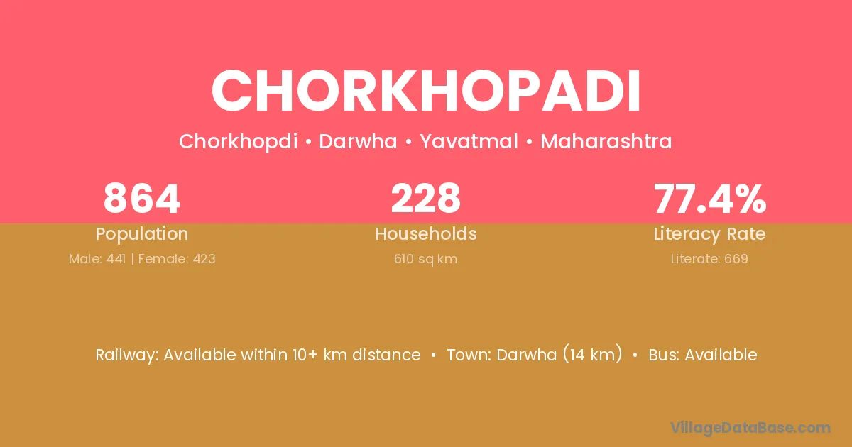 Darwha (14 km) is the nearest town to Chorkhopadi village for major economic activities and is located approximately 14 km away.