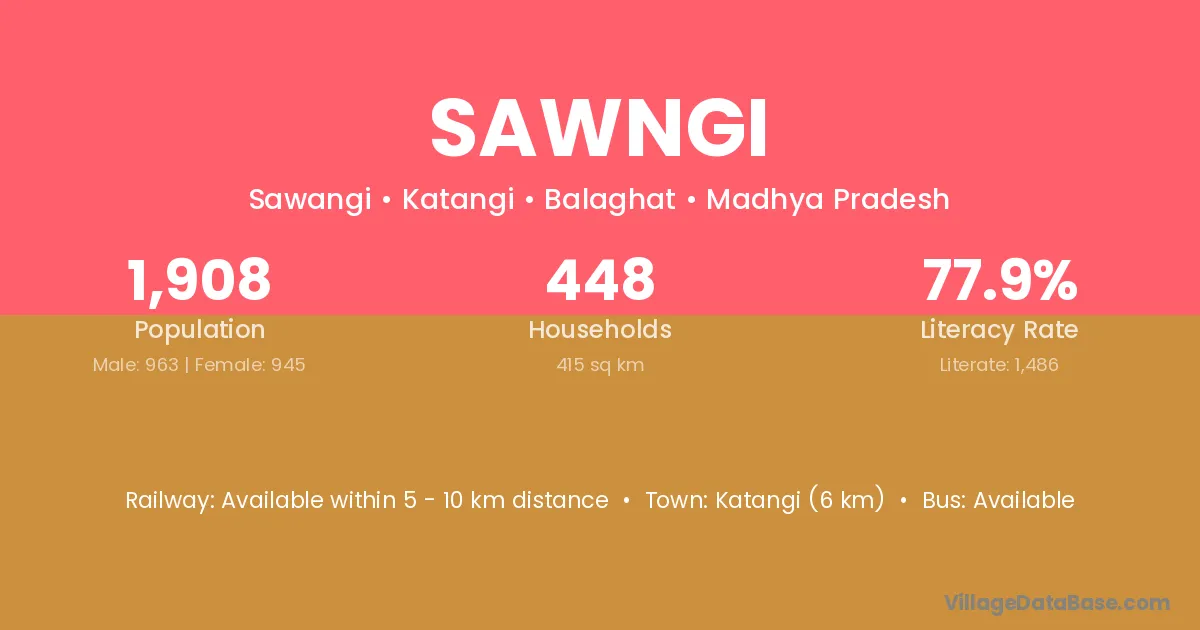 The literacy rate of Sawngi village is 71.88%. Male literacy stands at 79.27% and female literacy at 64.10%.