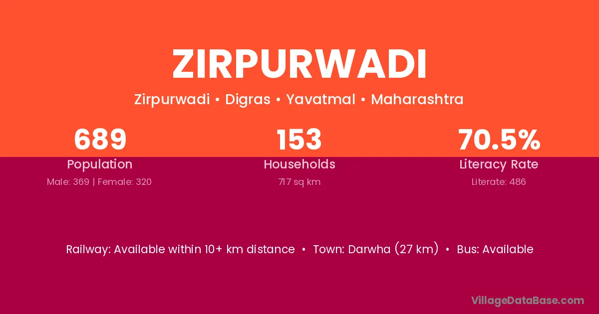 Zirpurwadi village has a total population of 689 people, of which 369 are males and 320 are females.