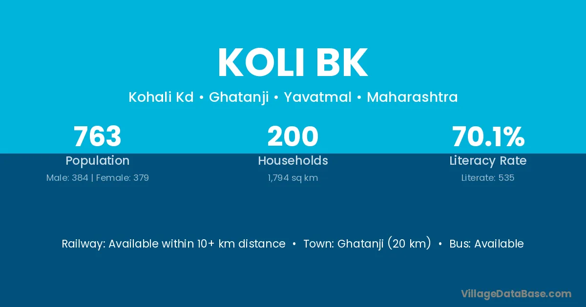 Ghatanji (20 km) is the nearest town to Koli Bk village for major economic activities and is located approximately 20 km away.