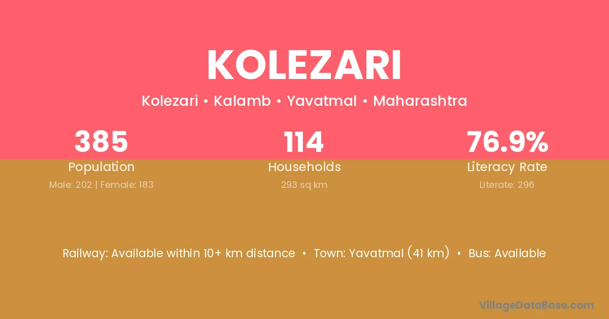 Yavatmal (41 km) is the nearest town to Kolezari village for major economic activities and is located approximately 41 km away.