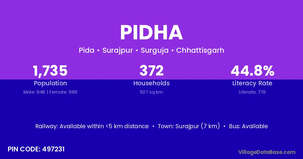 The literacy rate of Pidha village is 72.21%. Male literacy stands at 81.07% and female literacy at 63.89%.