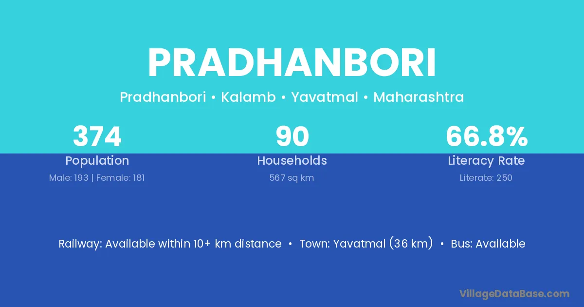 Yavatmal (36 km) is the nearest town to Pradhanbori village for major economic activities and is located approximately 36 km away.