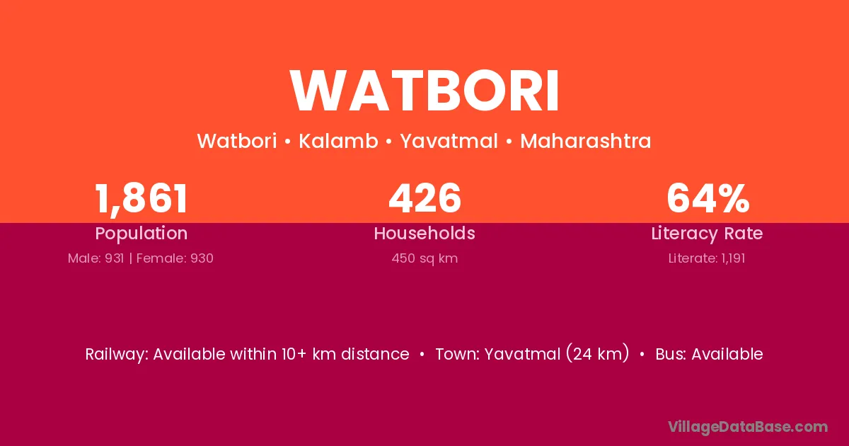 Yavatmal (24 km) is the nearest town to Watbori village for major economic activities and is located approximately 24 km away.