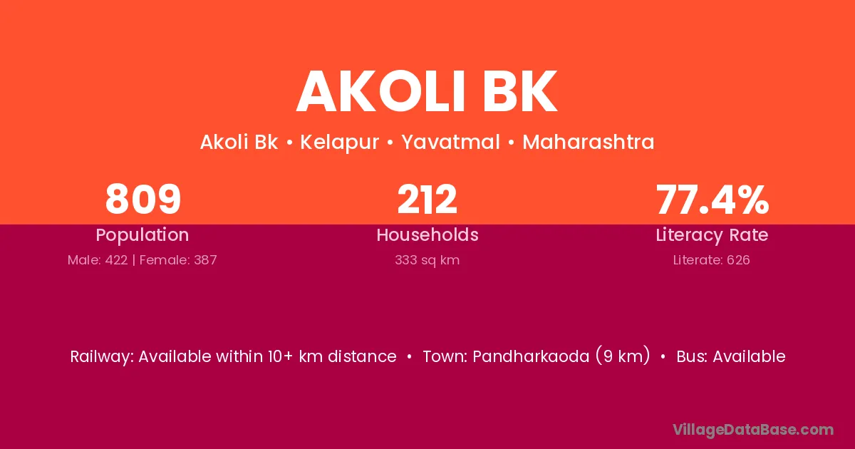 Pandharkaoda (9 km) is the nearest town to Akoli Bk village for major economic activities and is located approximately 9 km away.
