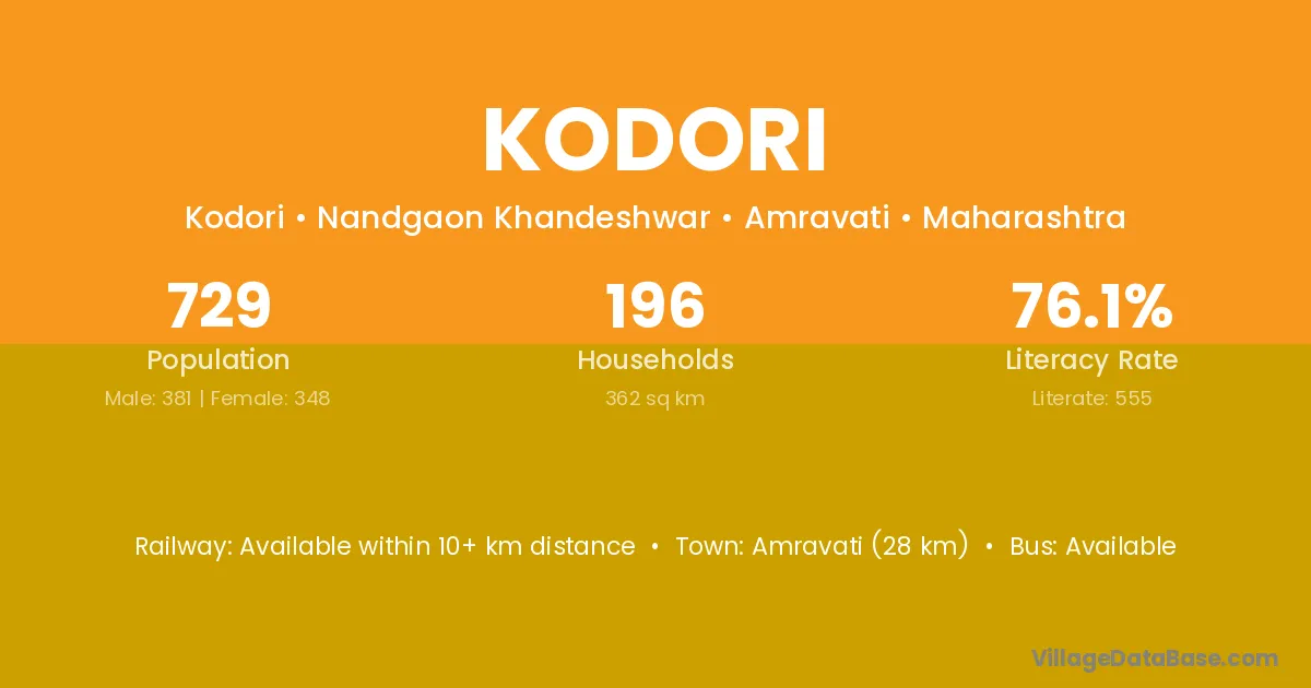 Pandharkaoda (25 km) is the nearest town to Kodori village for major economic activities and is located approximately 25 km away.