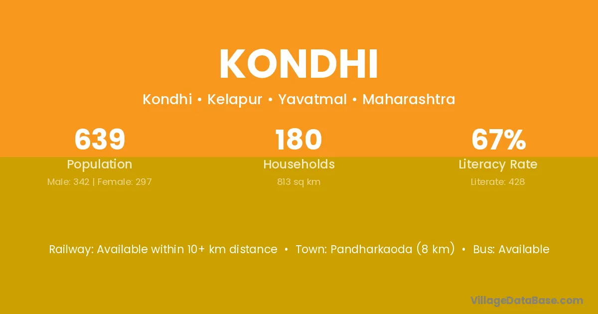 Pandharkaoda (8 km) is the nearest town to Kondhi village for major economic activities and is located approximately 8 km away.