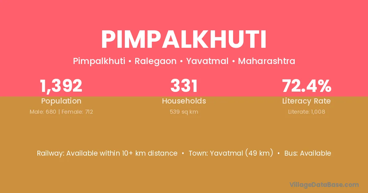 Pandharkaoda (25 km) is the nearest town to Pimpalkhuti village for major economic activities and is located approximately 25 km away.