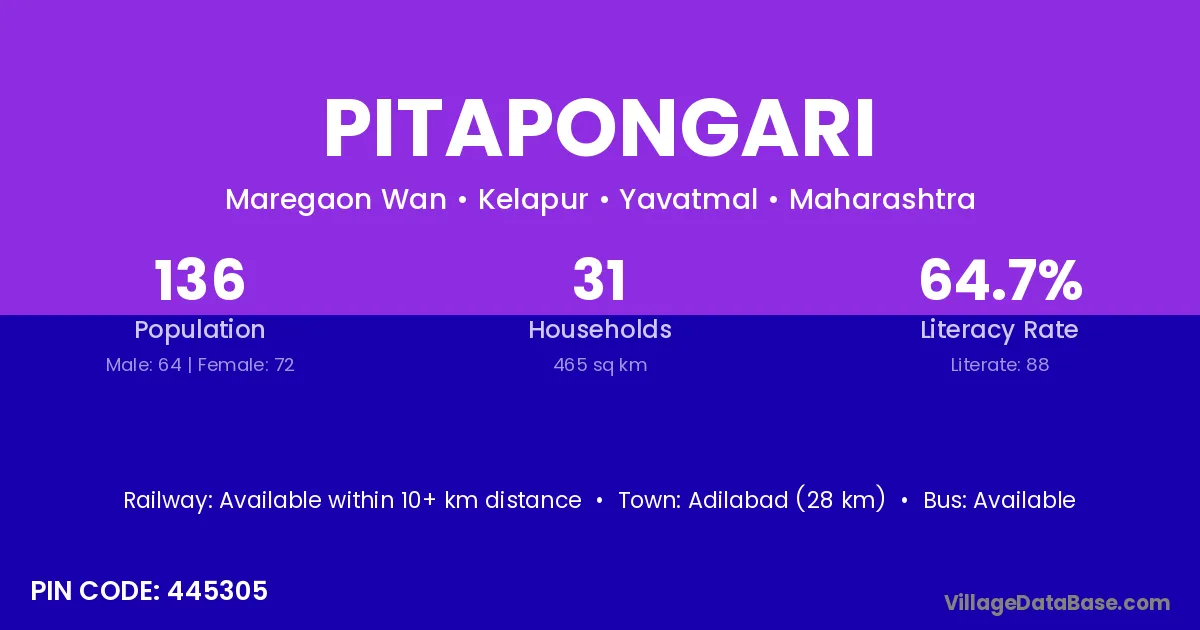Adilabad (28 km) is the nearest town to Pitapongari village for major economic activities and is located approximately 28 km away.