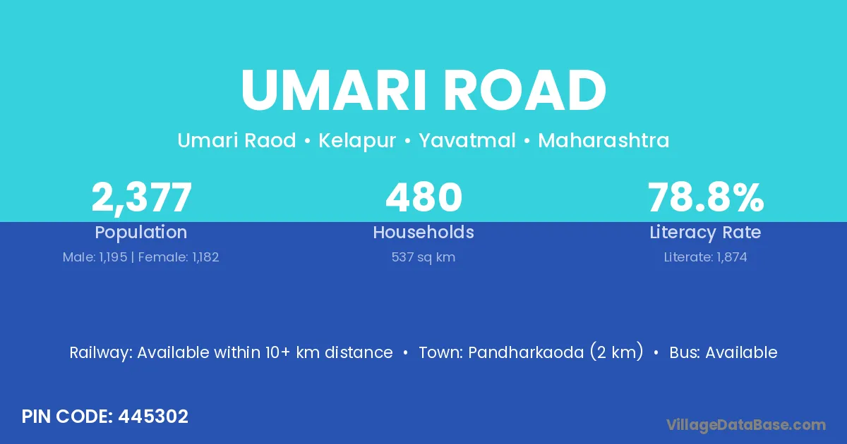 Pandharkaoda (2 km) is the nearest town to Umari Road village for major economic activities and is located approximately 2 km away.