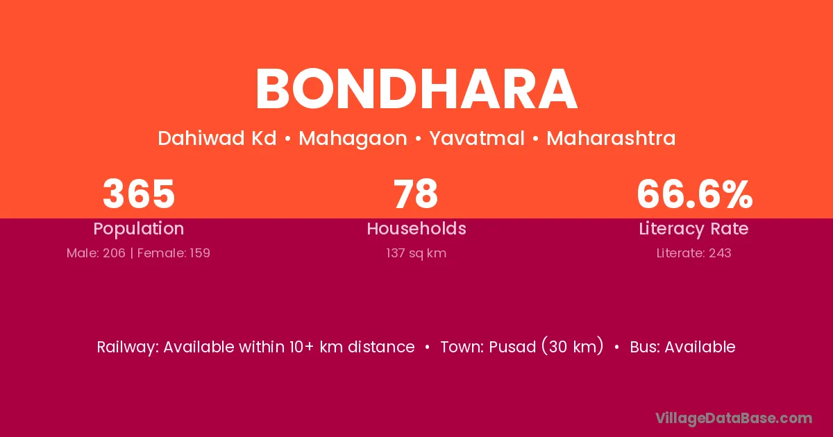 Pusad (30 km) is the nearest town to Bondhara village for major economic activities and is located approximately 30 km away.