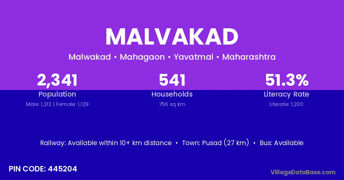 Pusad (27 km) is the nearest town to Malvakad village for major economic activities and is located approximately 27 km away.