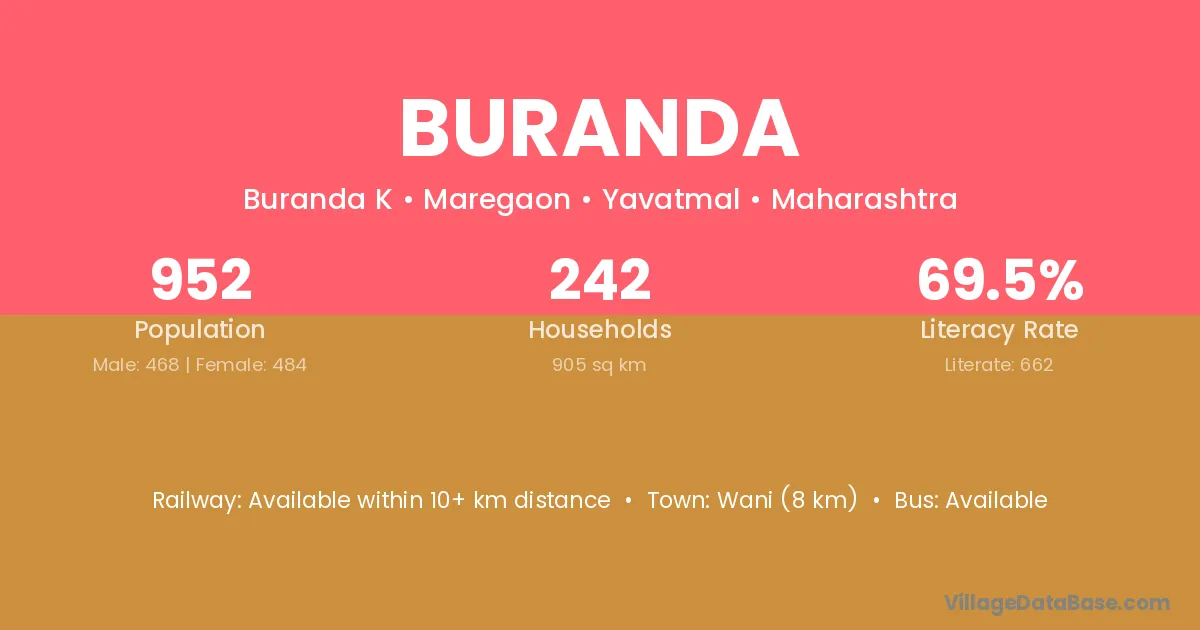 Buranda village has a total population of 952 people, of which 468 are males and 484 are females.