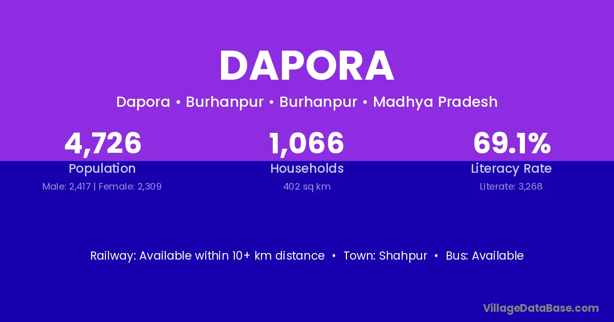 Wani (37 km) is the nearest town to Dapora village for major economic activities and is located approximately 37 km away.