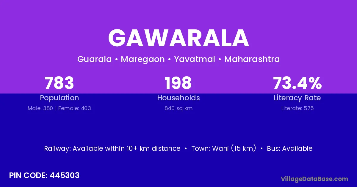 Wani (15 km) is the nearest town to Gawarala village for major economic activities and is located approximately 15 km away.