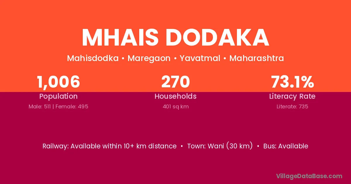 Wani (30 km) is the nearest town to Mhais Dodaka village for major economic activities and is located approximately 30 km away.