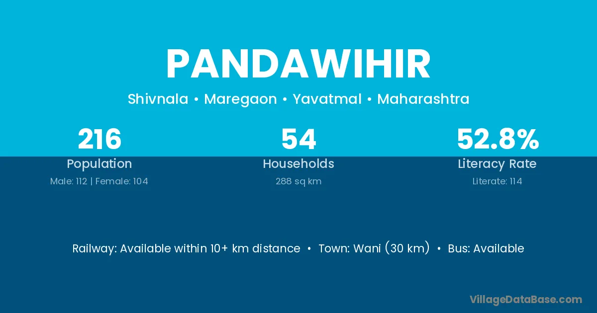 Wani (30 km) is the nearest town to Pandawihir village for major economic activities and is located approximately 30 km away.