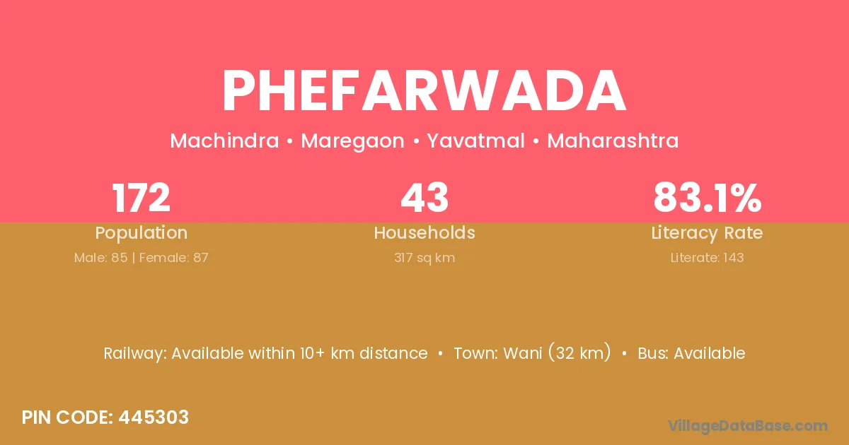 Wani (32 km) is the nearest town to Phefarwada village for major economic activities and is located approximately 32 km away.