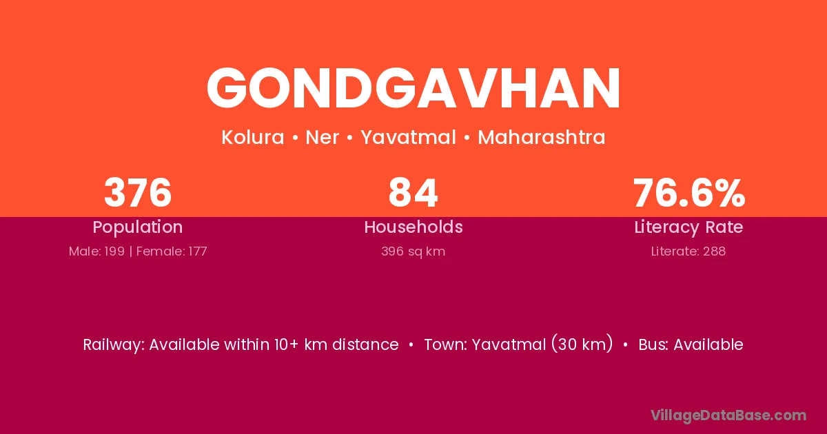 Yavatmal (30 km) is the nearest town to Gondgavhan village for major economic activities and is located approximately 30 km away.