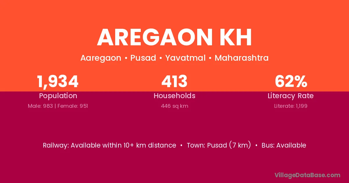 Pusad (7 km) is the nearest town to Aregaon Kh village for major economic activities and is located approximately 7 km away.