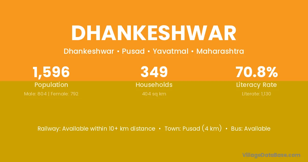 Pusad (4 km) is the nearest town to Dhankeshwar village for major economic activities and is located approximately 4 km away.