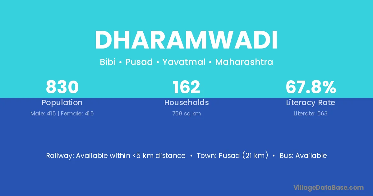 Pusad (21 km) is the nearest town to Dharamwadi village for major economic activities and is located approximately 21 km away.