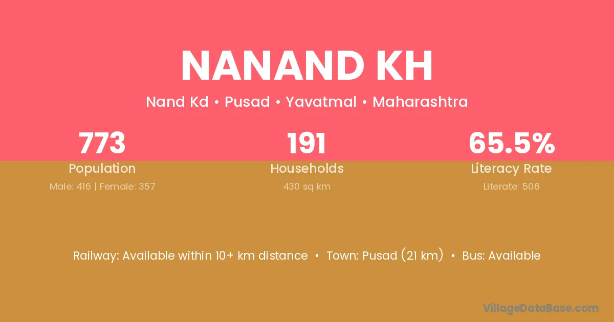 Pusad (21 km) is the nearest town to Nanand Kh village for major economic activities and is located approximately 21 km away.