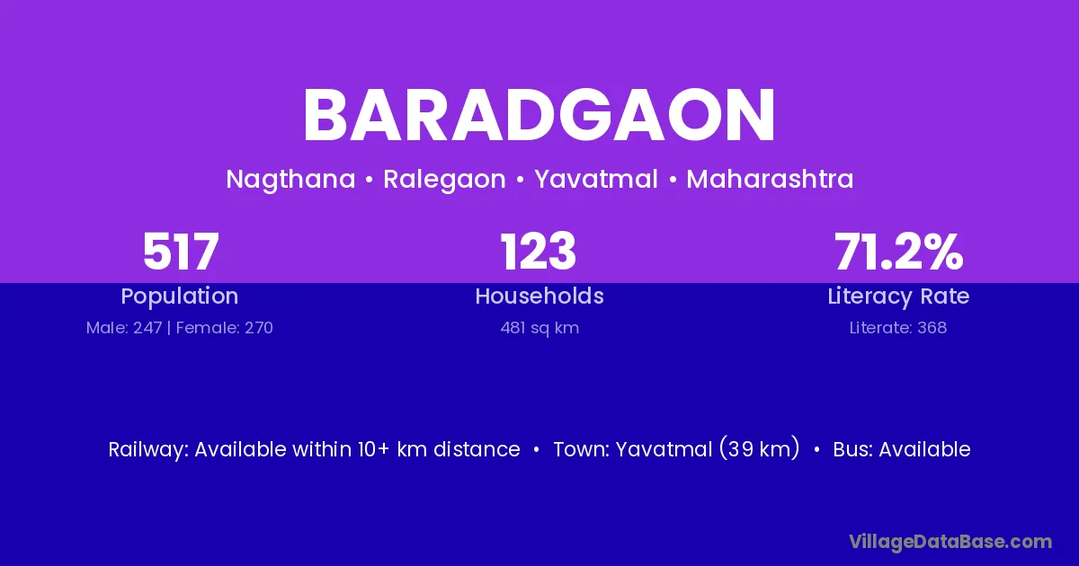 Yavatmal (39 km) is the nearest town to Baradgaon village for major economic activities and is located approximately 39 km away.