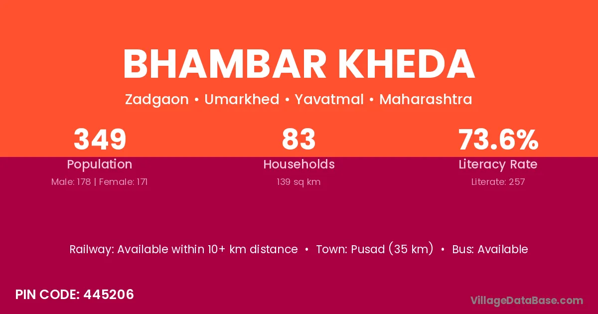 Pusad (35 km) is the nearest town to Bhambar Kheda village for major economic activities and is located approximately 35 km away.