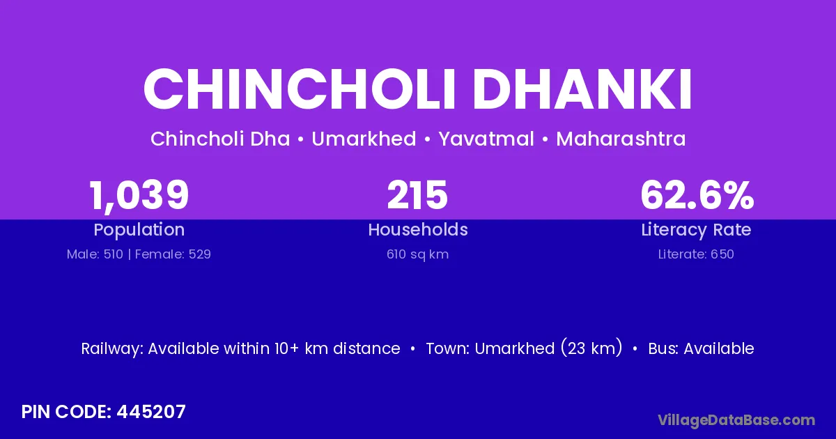 Umarkhed (23 km) is the nearest town to Chincholi Dhanki village for major economic activities and is located approximately 23 km away.