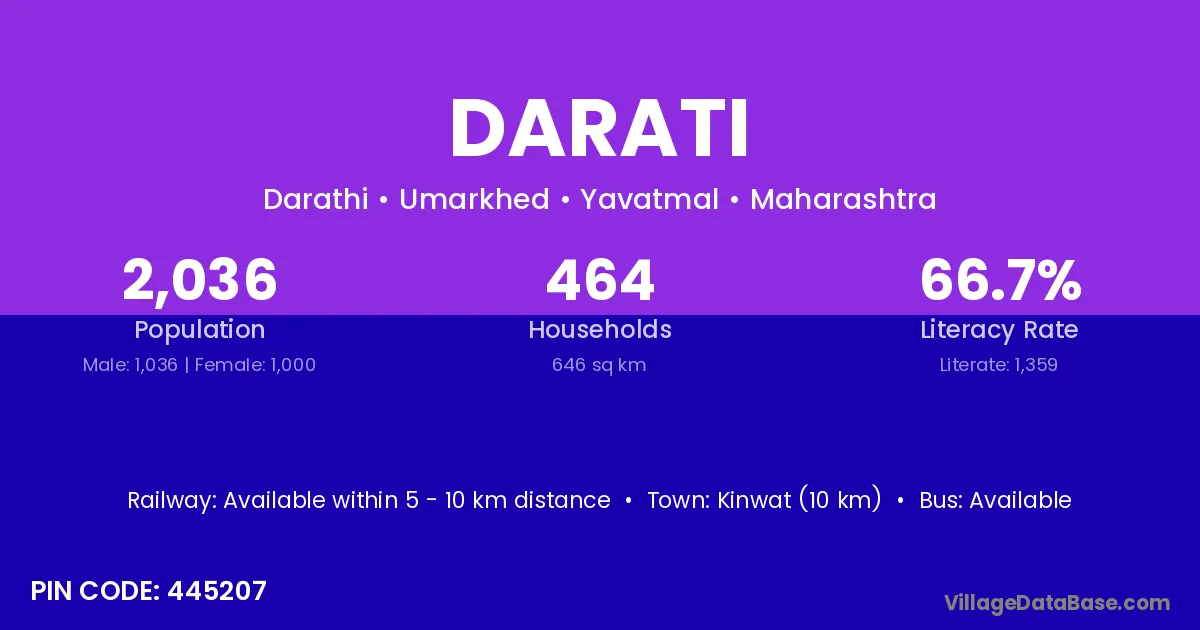 Kinwat (10 km) is the nearest town to Darati village for major economic activities and is located approximately 10 km away.