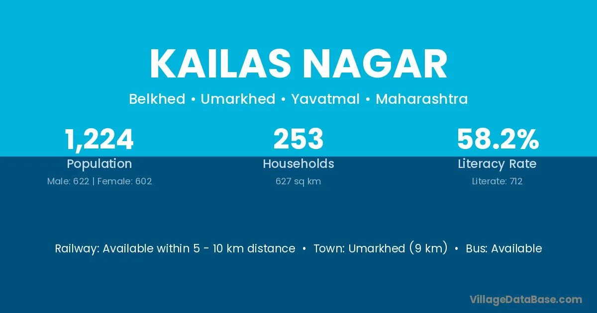Umarkhed (9 km) is the nearest town to Kailas Nagar village for major economic activities and is located approximately 9 km away.