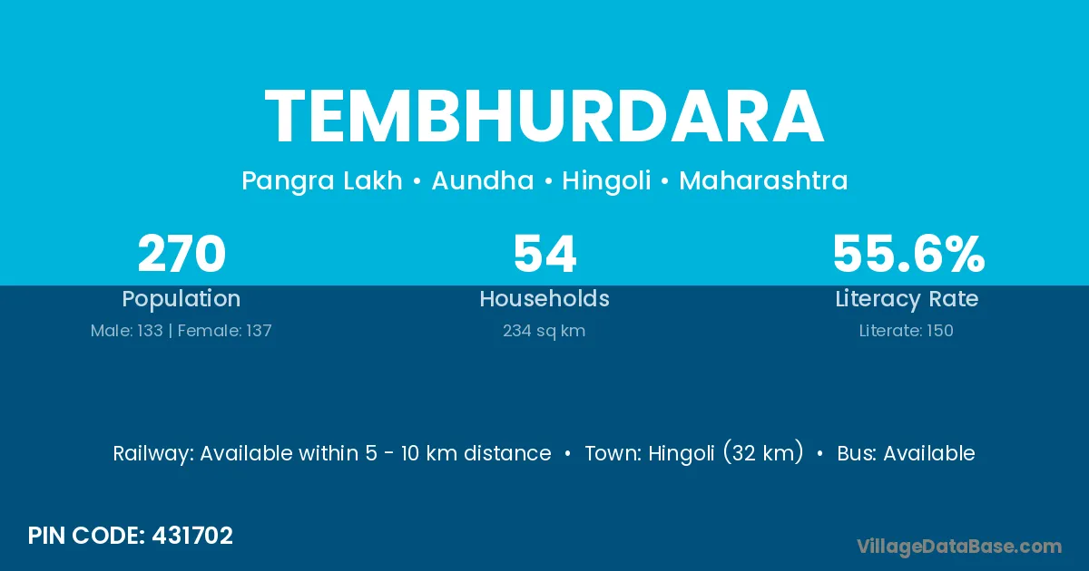 Umarkhed (25 km) is the nearest town to Tembhurdara village for major economic activities and is located approximately 25 km away.
