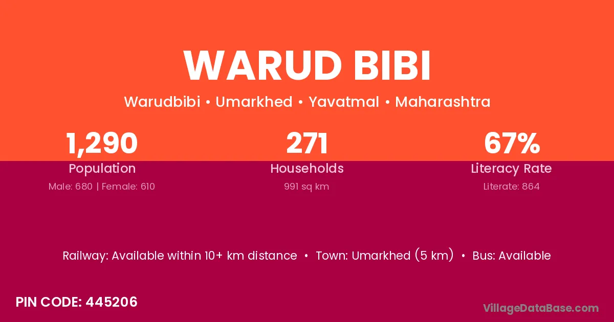 Umarkhed (5 km) is the nearest town to Warud Bibi village for major economic activities and is located approximately 5 km away.