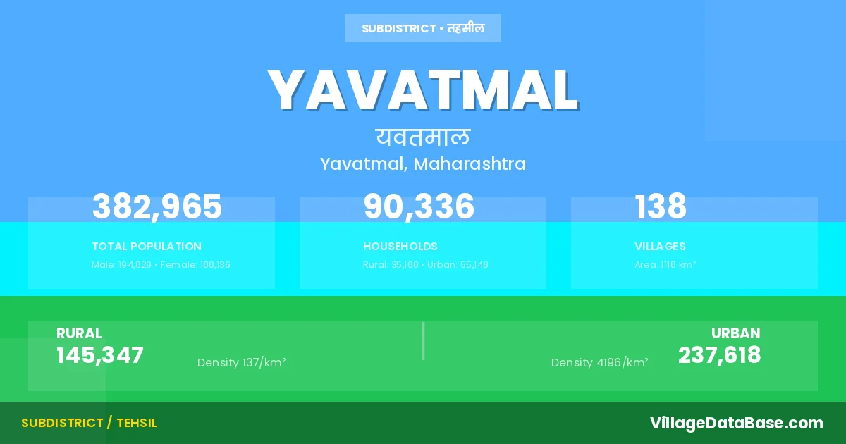 According to the 2011 census The total area of Yavatmal Tehsil is 1118 km², with a population of 382965 people. The population density is 343 inhabitants per square kilometre, and there are approximately 90336 houses in the sub district.