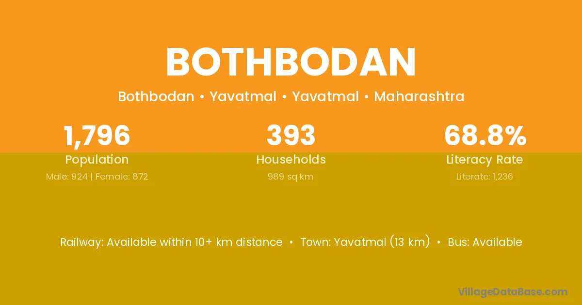 Yavatmal (13 km) is the nearest town to Bothbodan village for major economic activities and is located approximately 13 km away.