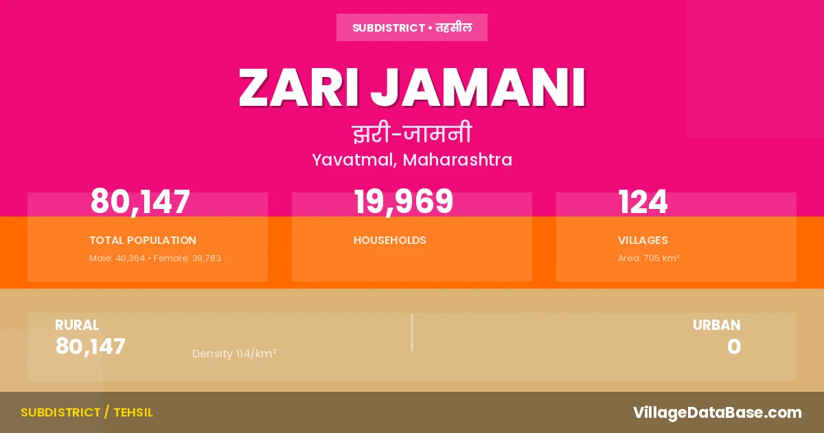 Zari Jamani is a town and Tehsil in the Yavatmal district of the Maharashtra. In India, a Tehsil is a subdivision of a district responsible for the administration and revenue collection of a specific area within the district. Tehsils play a crucial role in the local governance structure, contributing significantly to the development and administration of their communities.