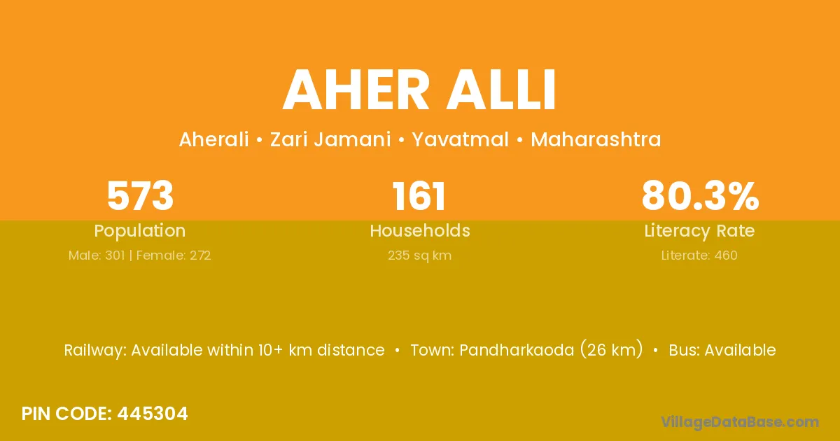 Pandharkaoda (26 km) is the nearest town to Aher Alli village for major economic activities and is located approximately 26 km away.