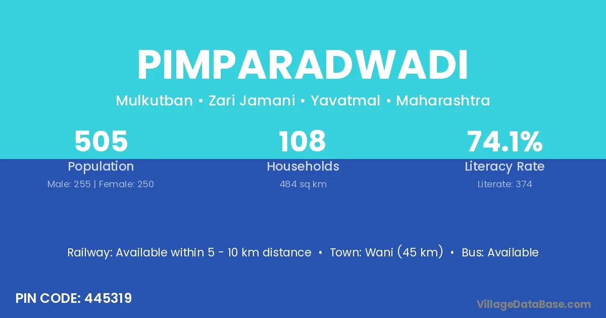 Wani (45 km) is the nearest town to Pimparadwadi village for major economic activities and is located approximately 45 km away.